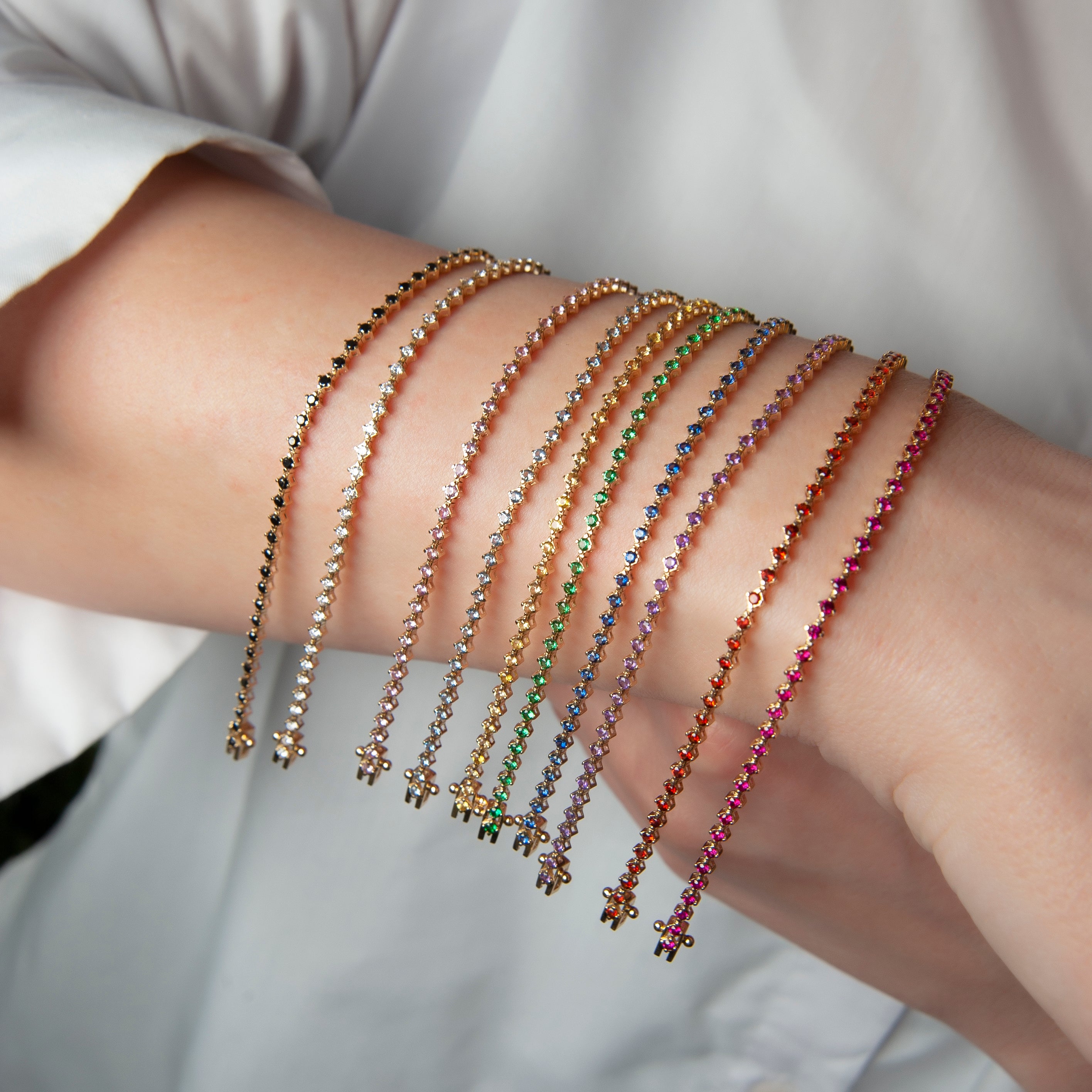 Each stone measures approximately 2.00 mm and is securely set in a slim solid gold structure, creating a refined bracelet that sparkles with vibrant purple tones. The secure box clasp with safety latch ensures durability, making it suitable for both everyday wear and special occasions.