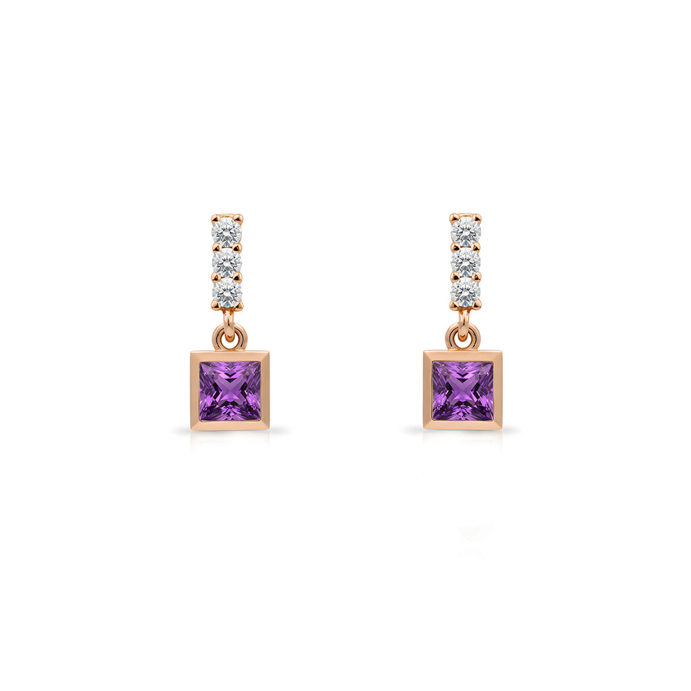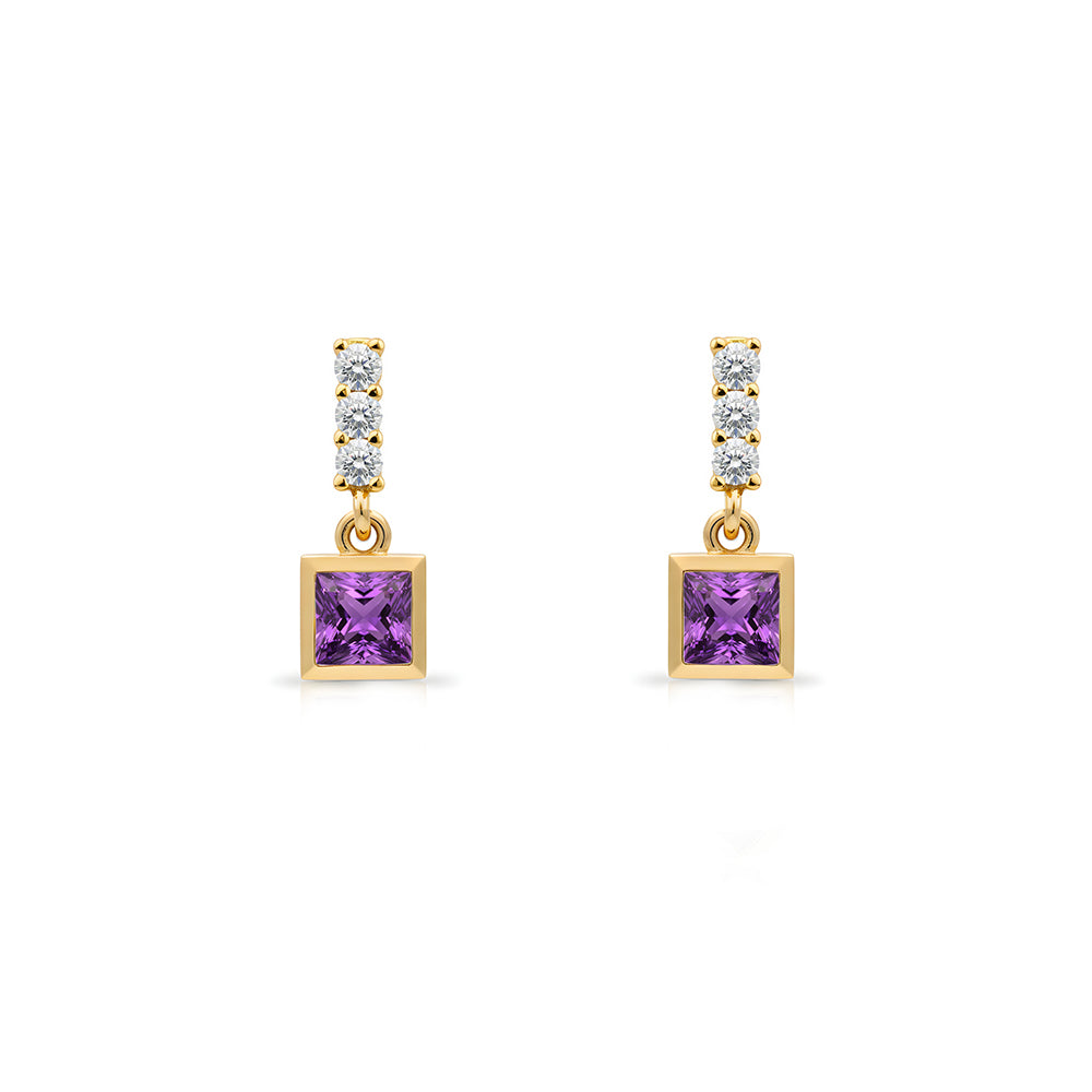These 14K gold amethyst drop earrings feature a vivid square-cut purple amethyst accented with sparkling diamonds for a refined and modern look. Designed to elevate both everyday outfits and special occasions, these amethyst earrings reflect timeless elegance, feminine charm, and understated luxury. A perfect gift for women who love sophisticated gemstone jewelry.