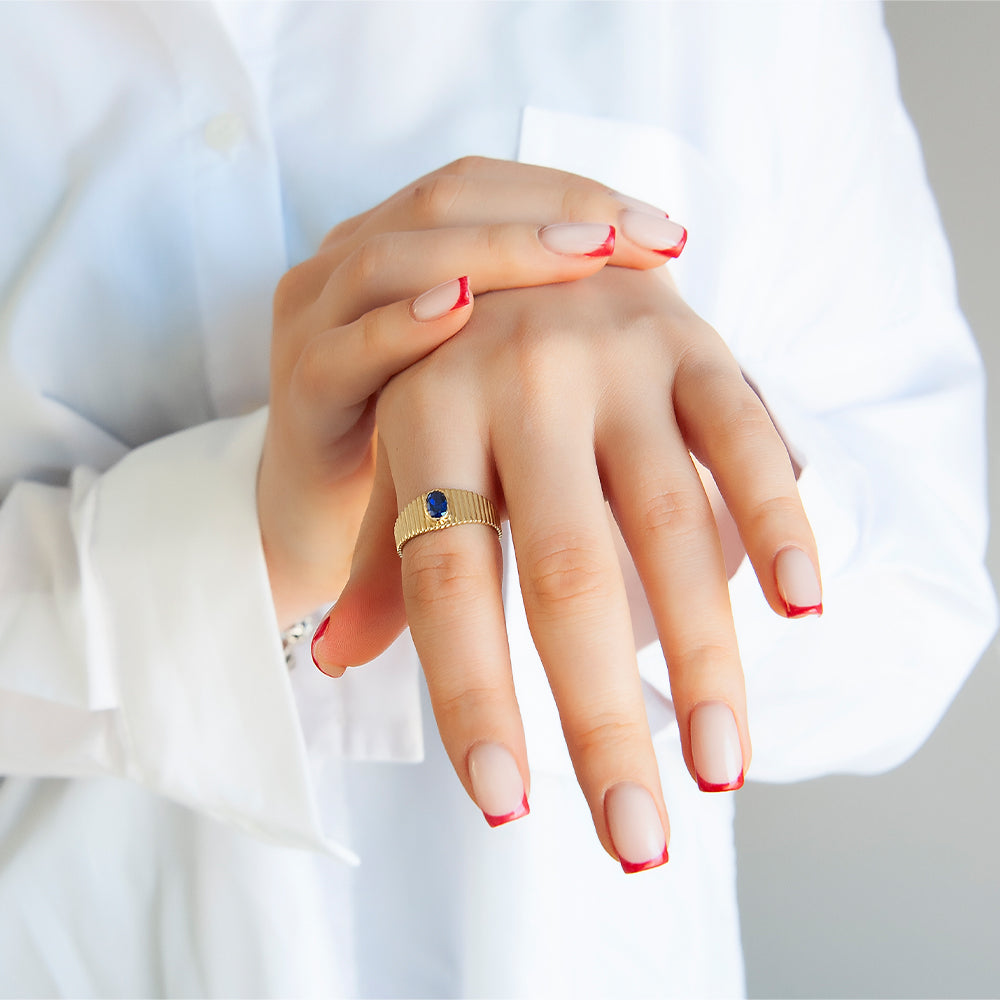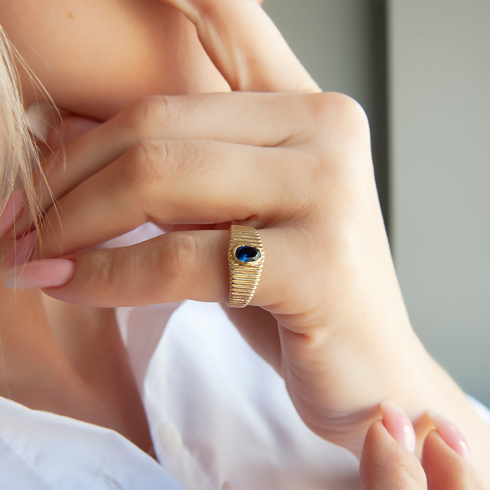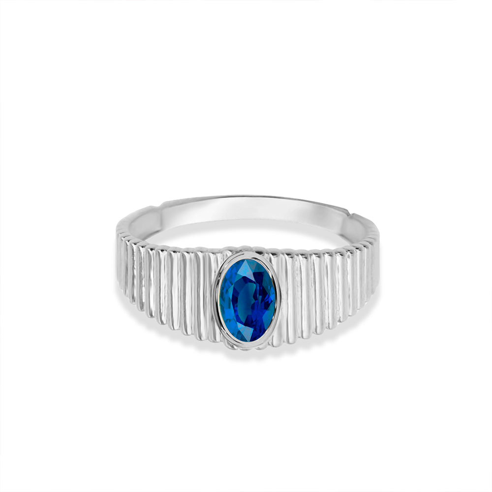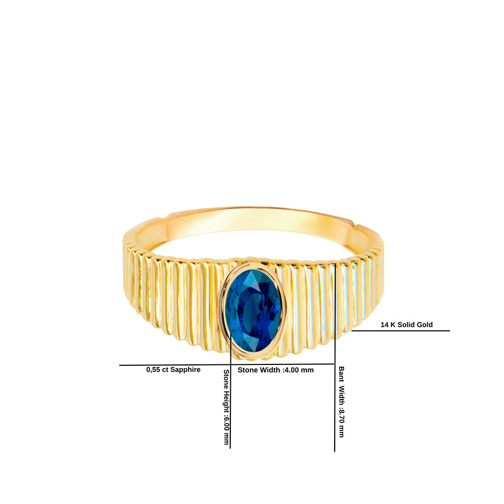 Elegant gold ring featuring an oval-cut blue sapphire set in a unique textured band. Perfect for engagements, special occasions, or as a timeless gift, this solitaire-style ring adds a touch of sophistication and elegance to any outfit.