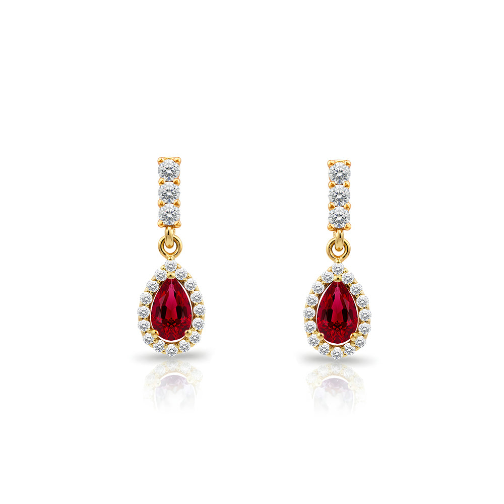 These 14K gold ruby halo drop earrings feature a vivid pear-cut ruby framed by a shimmering halo for a truly radiant finish. Their bold color and elegant design make them perfect for romantic occasions or statement looks. Lightweight, refined, and eye-catching, they are a memorable and heartfelt gift for her.