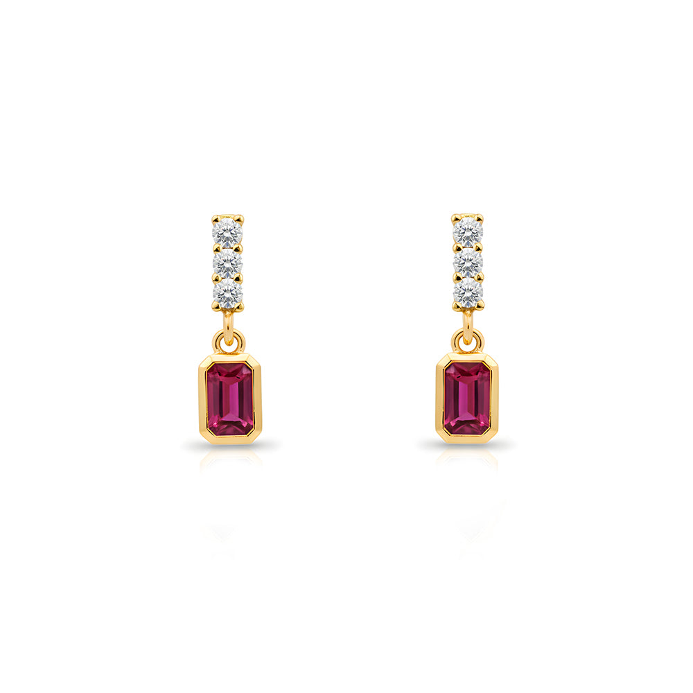 These 14K gold ruby drop earrings feature a rich red rectangular-cut ruby accented with sparkling diamond details for a bold yet elegant look. Designed for everyday wear and special occasions, these ruby earrings reflect timeless beauty, confidence, and refined luxury. A perfect gift for women who love classic gemstone jewelry with a modern touch.