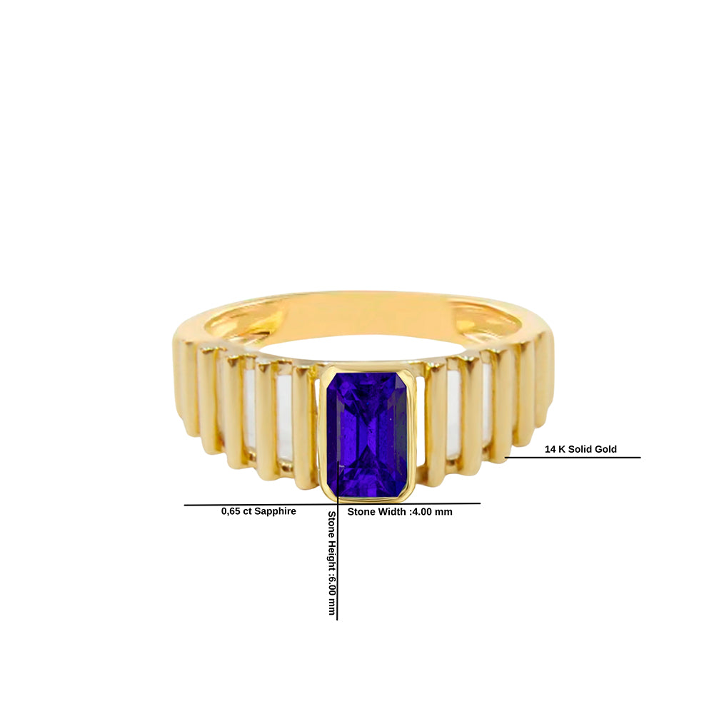 This stunning gold ring features a rectangular blue sapphire gemstone set in a unique band design. A perfect blend of elegance and modern style, ideal for special occasions or daily wear.